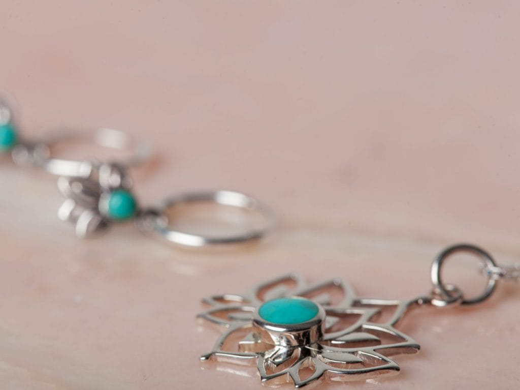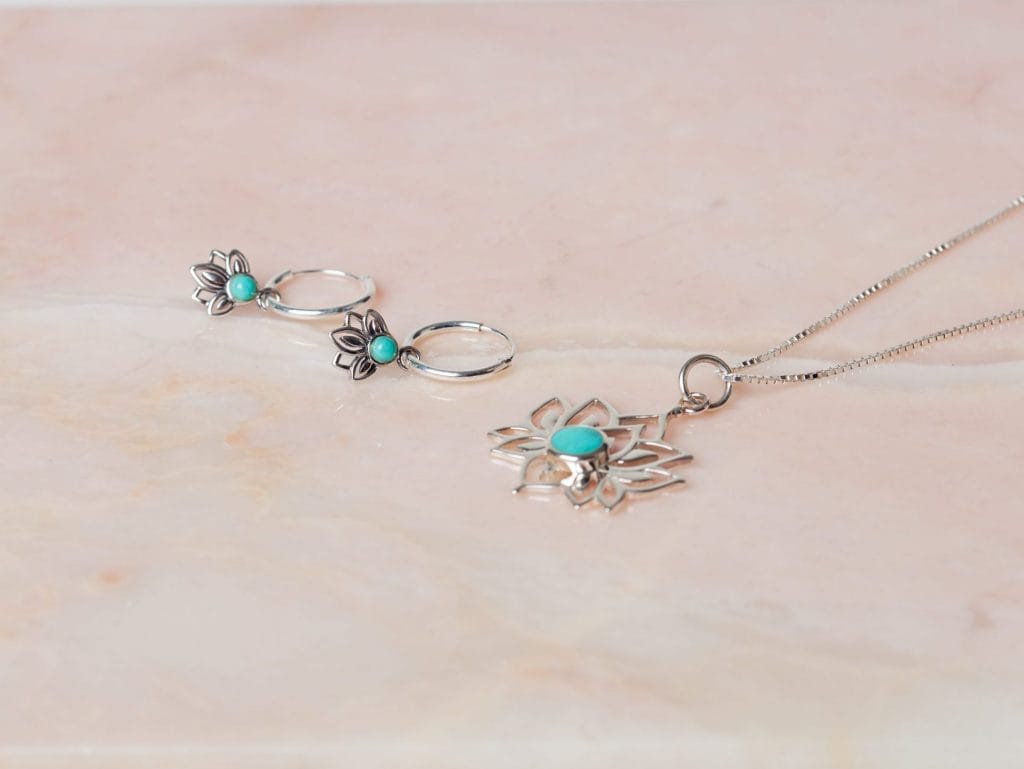 Sieradenset Lotus Turquoise bestaat uit een ketting met hanger en oorbellen in de vorm van een lotusbloem met turquoise steen. Deze elegante sieraden zijn volledig gemaakt van 925 sterling zilver. De lotusbloem geeft een verfijnde uitstraling, wat deze ketting met bijpassende oorbellen geschikt maakt voor iedere gelegenheid. De oorbellen zijn ook apart verkrijgbaar. De afgebeelde ring is niet inbegrepen, maar wel apart verkrijgbaar in diverse maten.