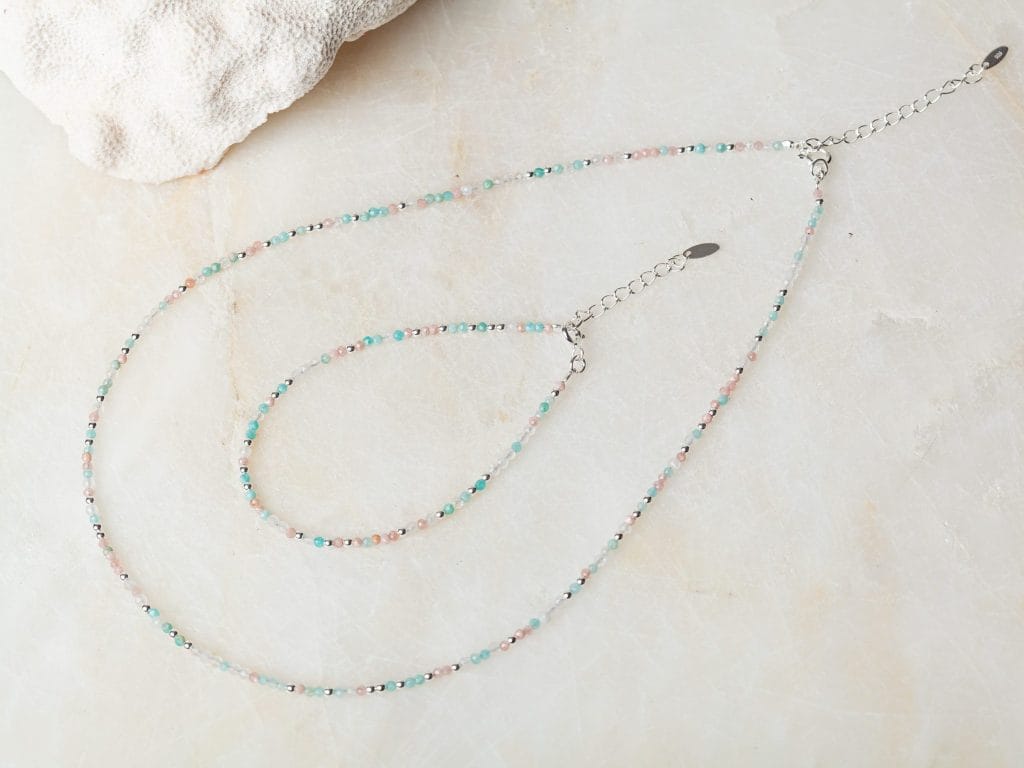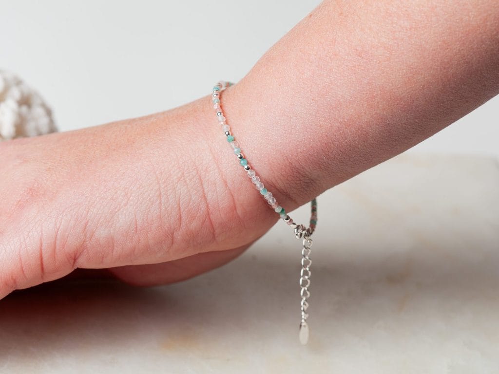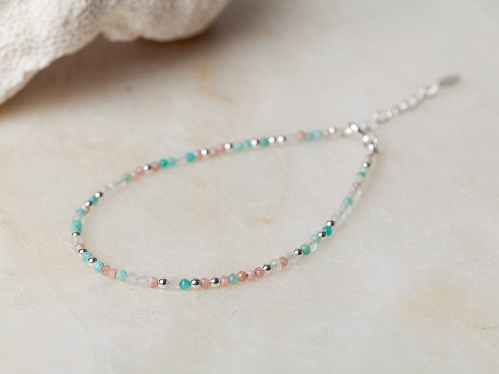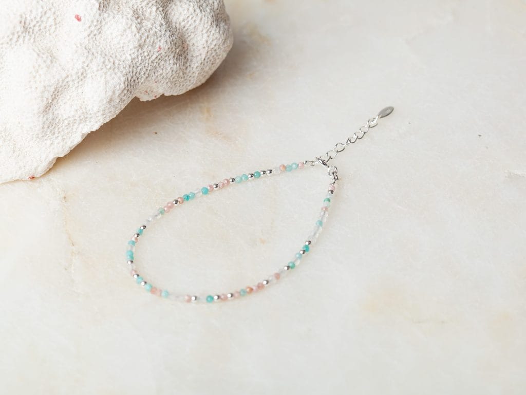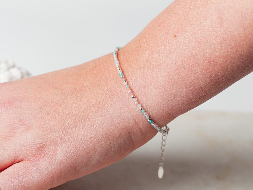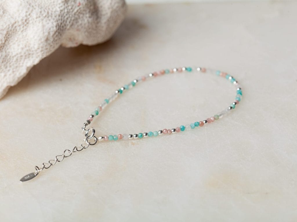 Bracelet Gemstone Elements is een prachtige armband met een natuurlijke vorm. Deze armband is volledig vervaardigd van 925 sterling zilver en gemixte edelsteentjes, waaronder Turquoise, Rozenkwarts en Maansteen. Elk edelsteentje is weer anders. Dat is de charme van natuursteen. De armband is ook verkrijgbaar met donkere gemengde edelstenen, Rode Granaat, Amethist, Turquoise, Aquamarijn, Bergkristal, Peridot, Lapis Lazuli en met aardetinten.