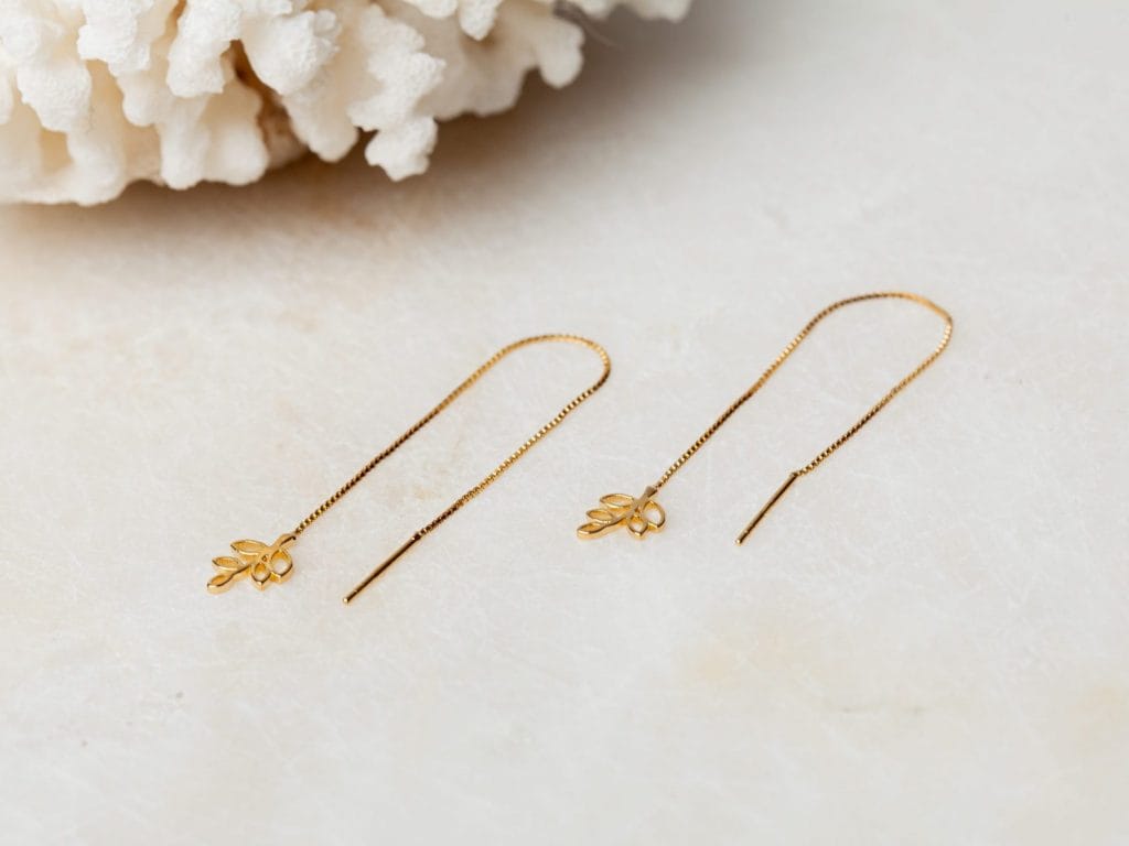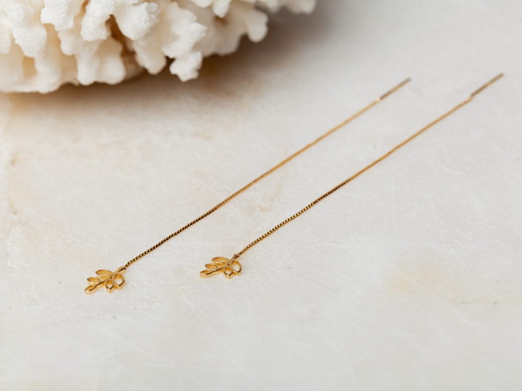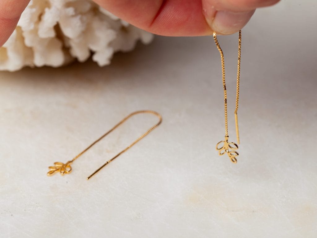 Ear Threader Fiore is een prachtige ear threader oorbel in de vorm van een kleine lauriertak. Deze stijlvolle zilveren zijn volledig gemaakt van 925 sterling zilver met daarover drie lagen 18K goud, en geven je outfit een lichte en luchtige look. Heb je meerdere gaatjes in je oren? Dan zijn deze gouden ear threaders mooi te combineren met een gouden oorknopje of oorringetje. Ear Threader Fiore is ook verkrijgbaar in zilver en 18 karaat rose goldplated. Al onze oorbellen worden per paar geleverd.