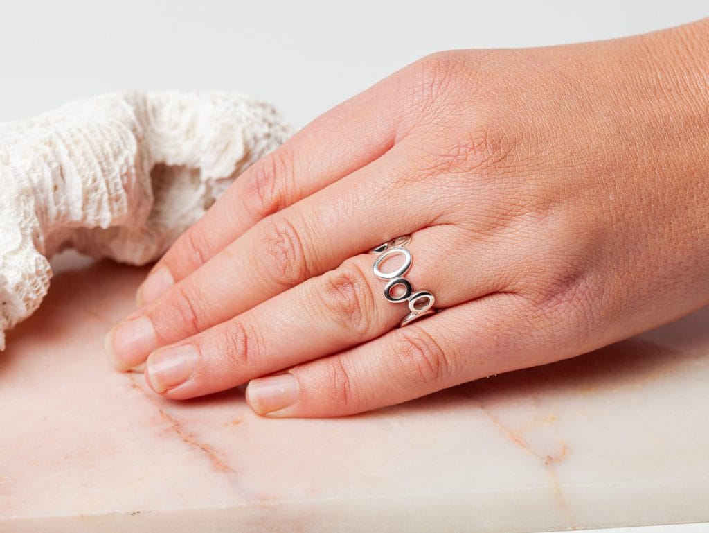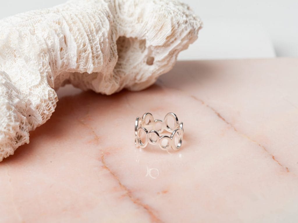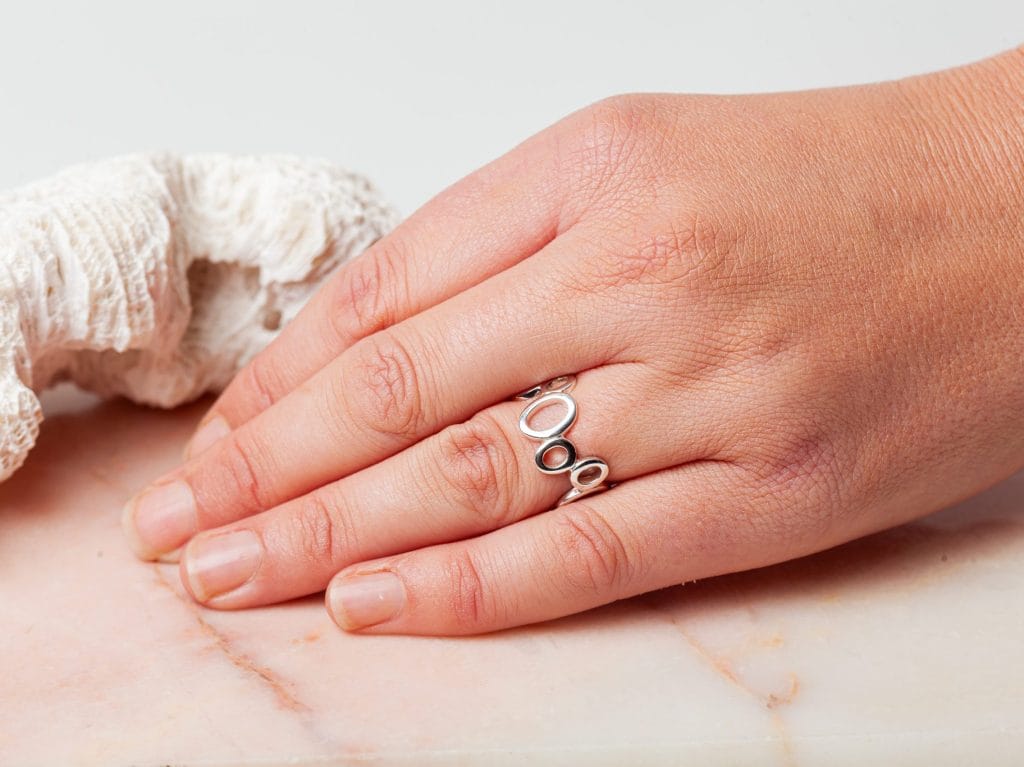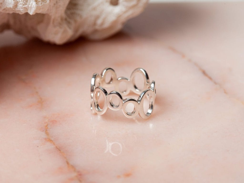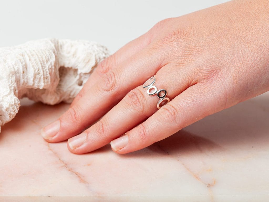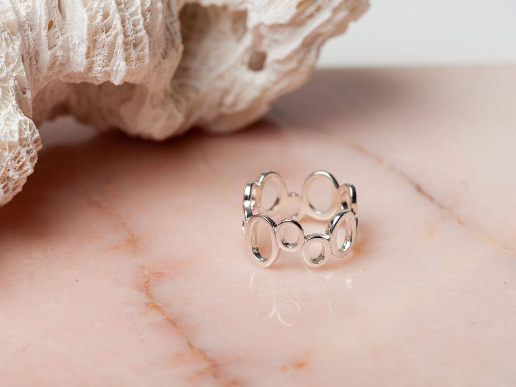 Ring Alina is een modieuze en elegante ring met een luchtige uitstraling die wordt gecreëerd door de opgestelde open cirkels van verschillende grootte. De ring is volledig gemaakt van 925 sterling zilver. Het sieraad is prachtig te combineren met ringen in verschillende stijlen. Denk bijvoorbeeld aan een combinatie met andere minimalistische zilveren ringen, of juist met opvallende statement ringen.