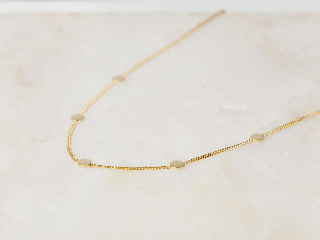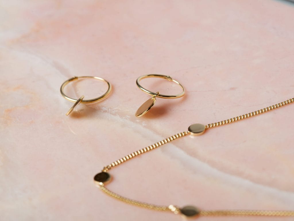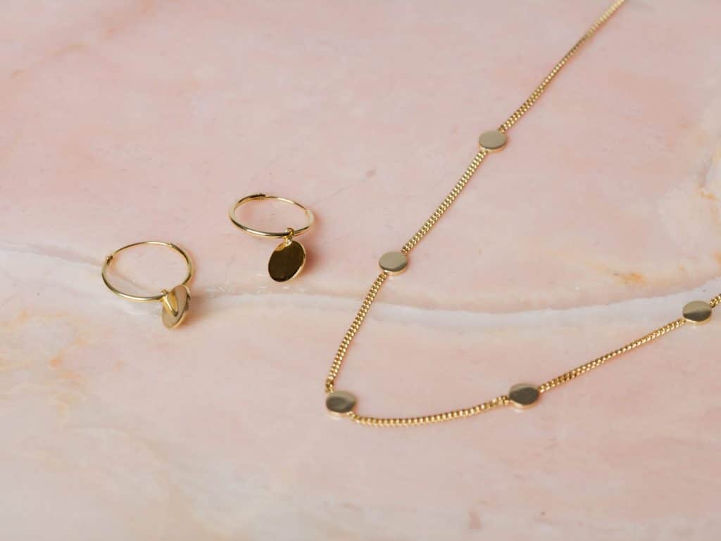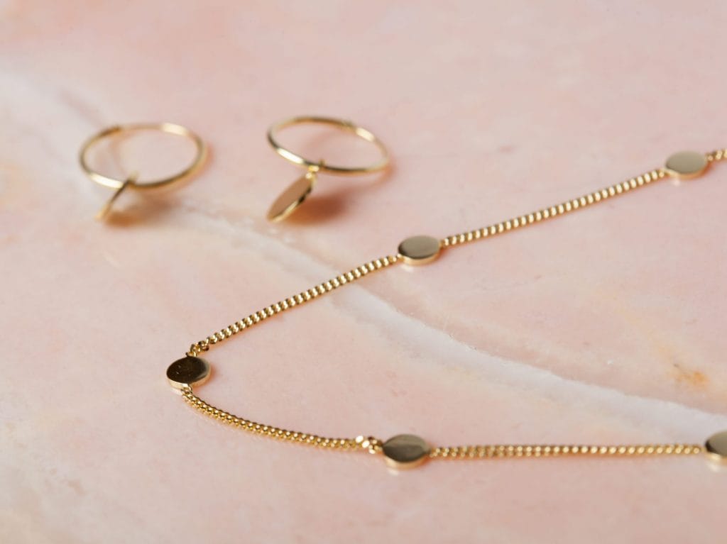 Sieradenset Filou bestaat uit een elegante ketting en hoop oorbellen met speelse muntjes. De sieraden hebben een minimalistische uitstraling en zijn volledig gemaakt van 925 sterling zilver met daarover drie lagen 18 karaat goud. De ketting is in lengte verstelbaar. De ketting en oorbellen zijn ook apart verkrijgbaar.