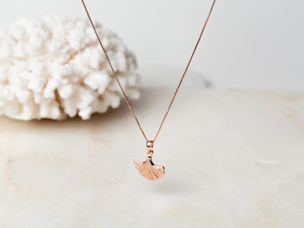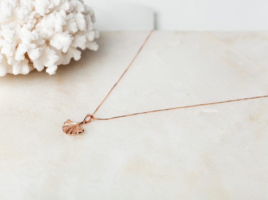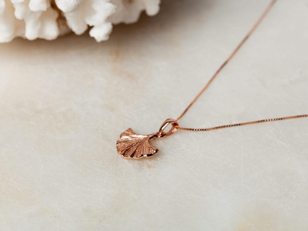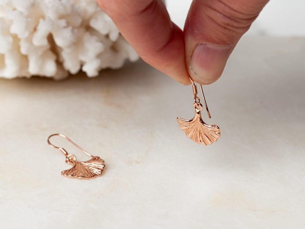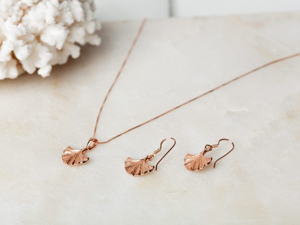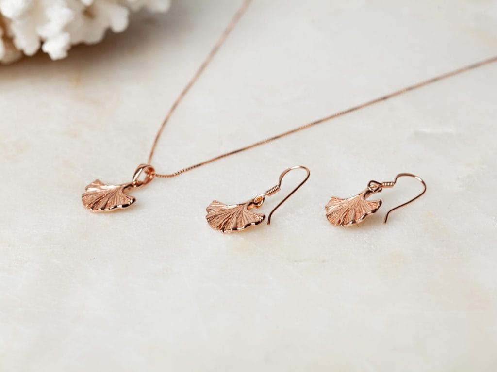 Sieradenset Ginkgo Leaf bestaat uit een ketting met hanger en oorbellen in de vorm van een artistiek ginkgo blad. De sieraden zijn volledig gemaakt van 925 sterling zilver met daarover drie lagen 18 karaat roségoud. Het ginkgo blad geeft een natuurlijke en elegante uitstraling, wat deze ketting met bijpassende oorbellen geschikt maakt voor iedere gelegenheid. De ketting en oorbellen zijn ook apart verkrijgbaar. Sieradenset Ginkgo Leaf is ook verkrijgbaar in oxidized zilver.