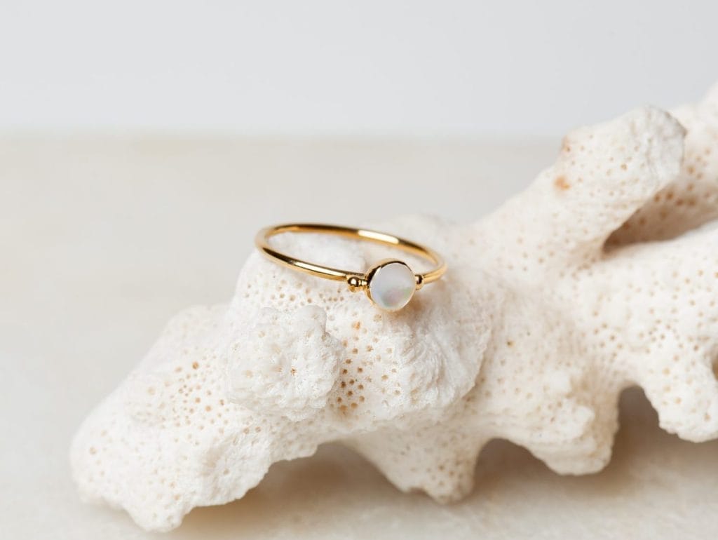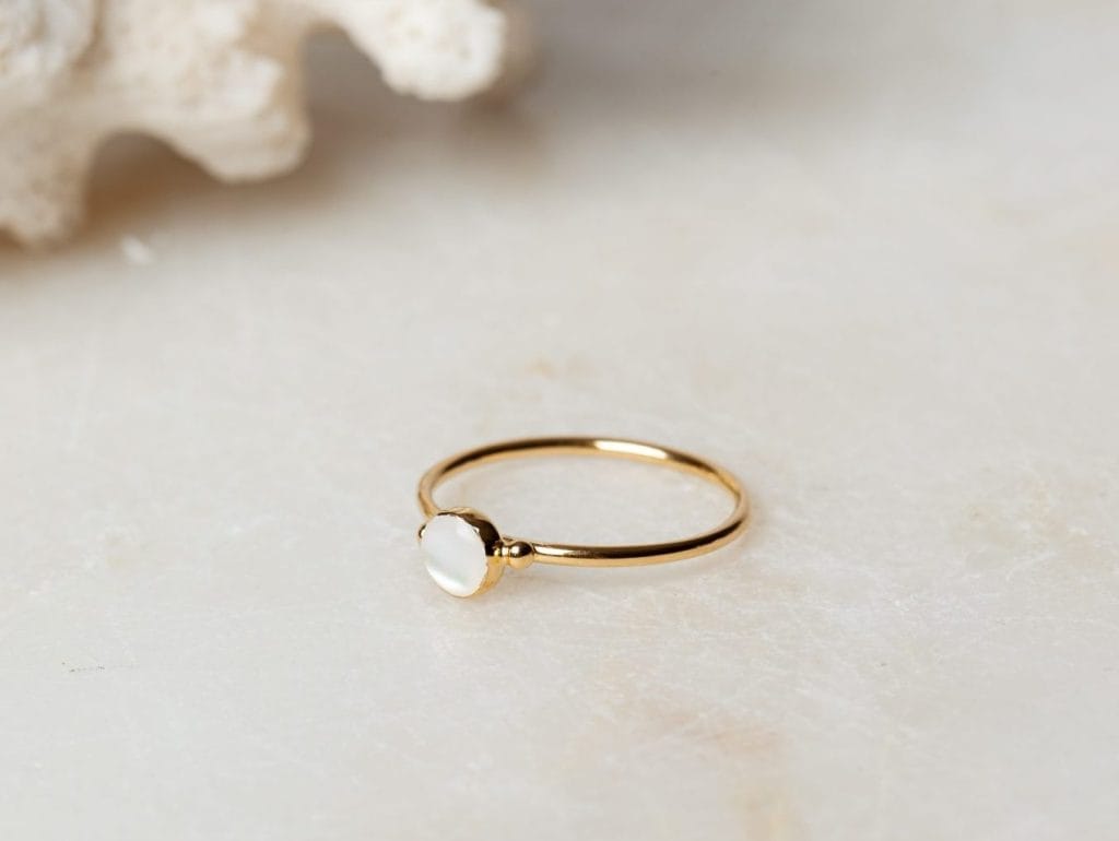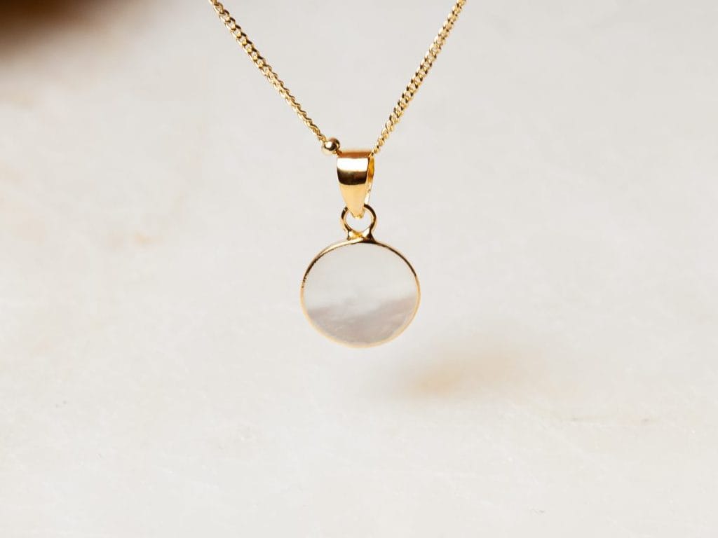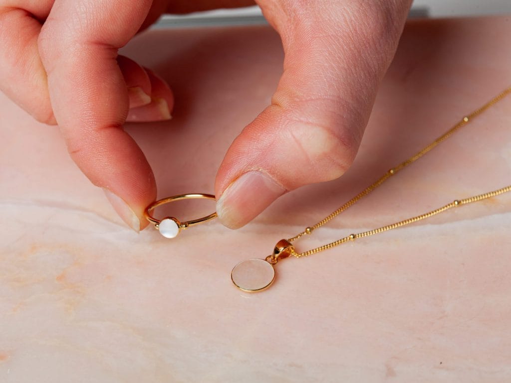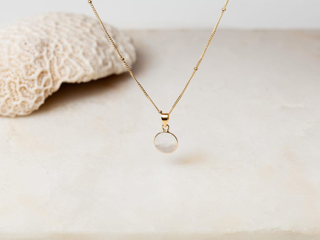De stijlvolle sieradenset June bestaat uit een ketting met hanger en een bijpassende ring. De subtiel vormgegeven sieraden zijn volledig gemaakt van 925 sterling zilver met daarover drie lagen 18 karaat goud. De hanger en de ring zijn ingezet met parelmoer, wat prachtig schittert naast het goud. De ketting is verkrijgbaar in verschillende lengtes en de ring in diverse maten. De ketting en ring zijn ook apart verkrijgbaar. De set is ook verkrijgbaar in 18 karaat rose goldplated.